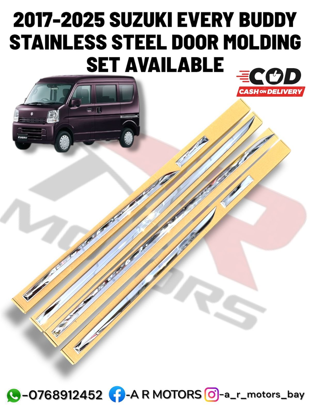Give your 2017-2025 Suzuki Every Buddy a premium side profile with a stainless steel door molding set. These moldings protect the doors from scratches, dents, and minor impacts while adding a polished metallic finish. Available at low prices in Sri Lanka, delivered near you with islandwide delivery including Colombo, they’re perfect for car owners seeking practical and stylish modifications. Easy to install and designed for a perfect fit, the moldings enhance the overall appearance of your vehicle. Upgrade your Suzuki Every Buddy with durable, high-quality accessories that combine aesthetics, protection, and everyday functionality seamlessly.