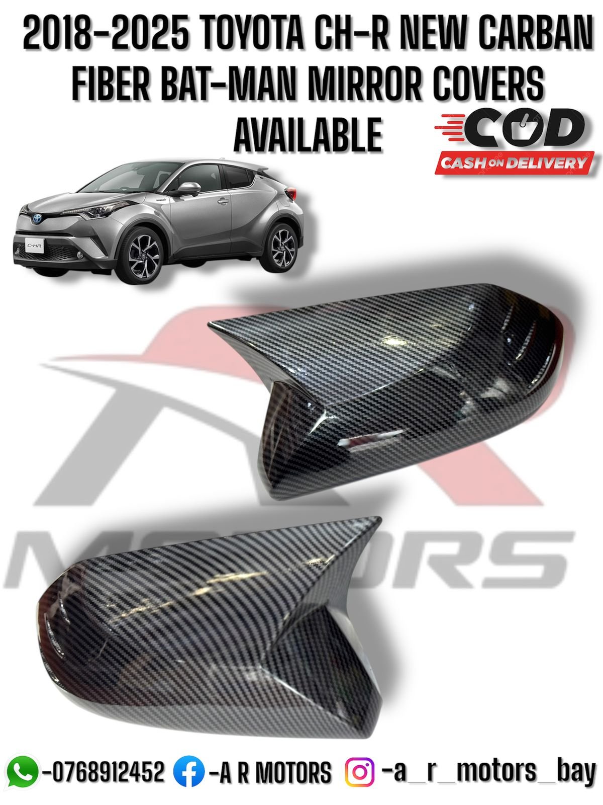 Upgrade your 2018-2025 Toyota C-HR with carbon fiber Bat-Man mirror covers that enhance style and protect your side mirrors. These lightweight and durable covers add a sporty, modern look while preventing scratches and wear. Available in Sri Lanka at low prices, delivered near you with islandwide delivery including Colombo, these covers are perfect for car enthusiasts seeking premium, affordable modifications. Designed for a perfect fit, they seamlessly integrate with your C-HR mirrors, elevating the overall vehicle aesthetic. Achieve a stylish and functional exterior upgrade with these carbon fiber mirror covers for your Toyota C-HR.
